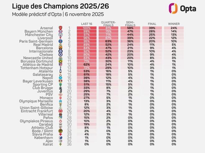 • Opta预测欧冠夺冠概率:阿森纳24%第一、拜仁、曼城二三位